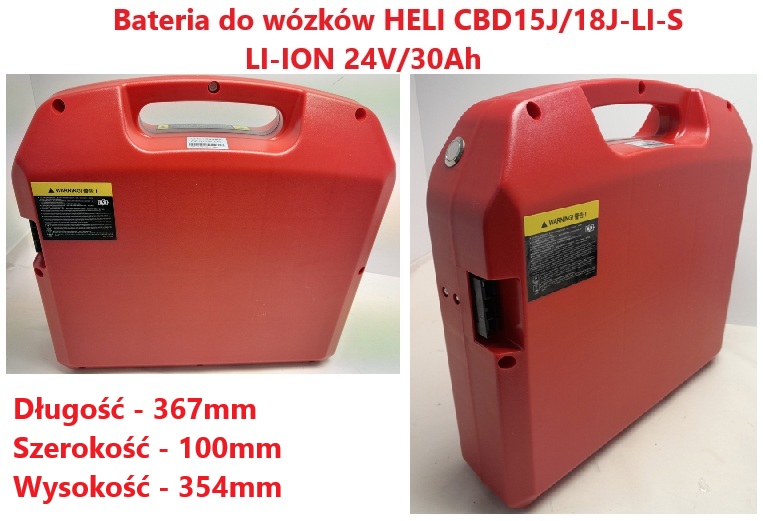 • BATERIA - AKUMULATOR DO WÓZKA Heli • Napięcie 24V • Pojemność 30Ah • Pasuje do wózka CBD15J/18J-Li-S • Wyjmowana bateria litowa Li-lon