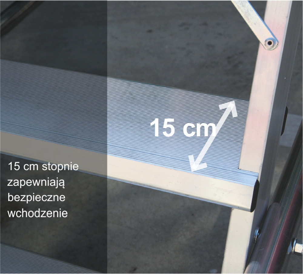 • 15-sto cm stopnie zapewniają bezpieczne wchodzenie