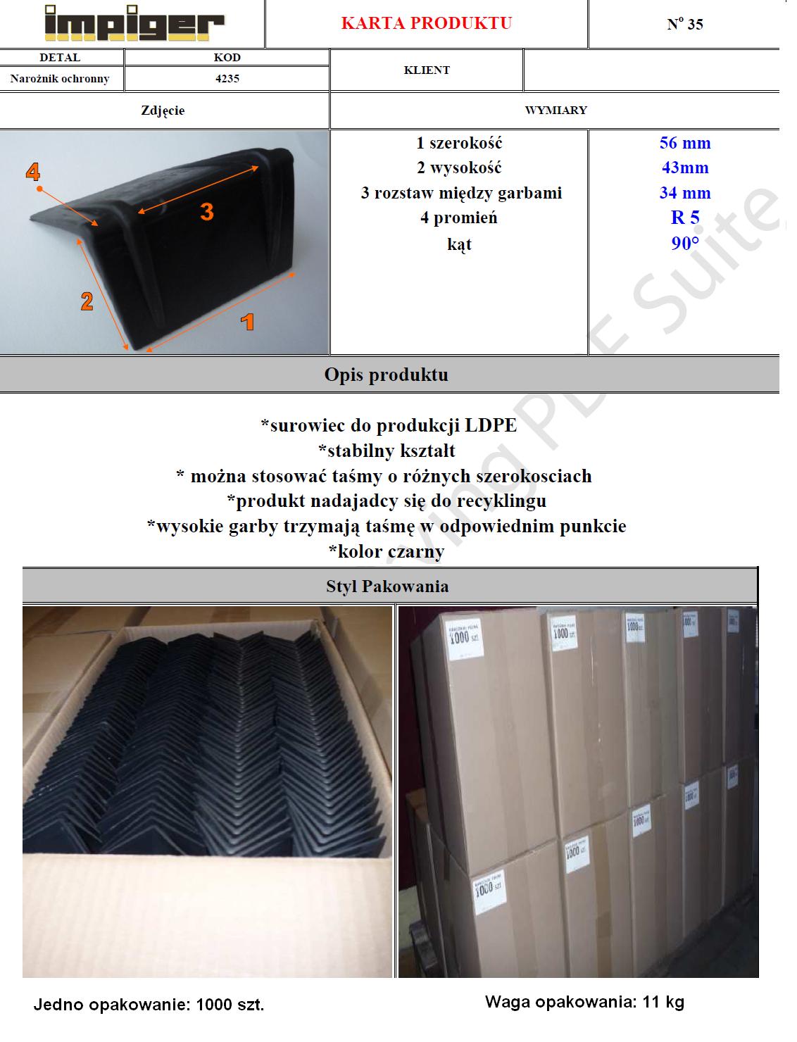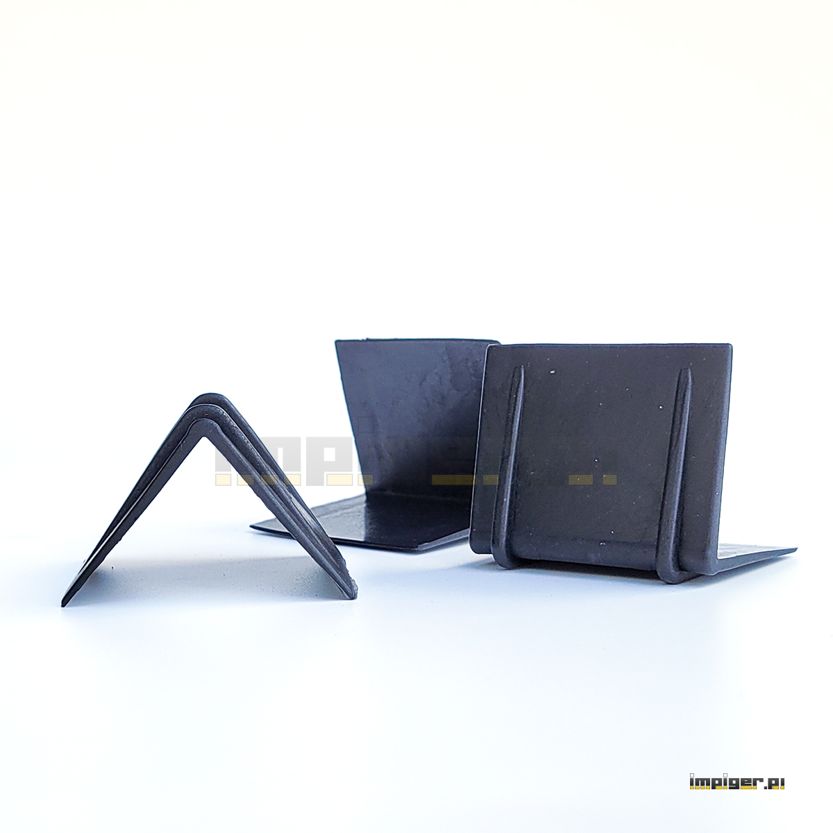 Narożnik PP ochronny przeznaczony jest do zabezpieczania krawędzi towarów spinanych taśmami oraz do ochrony tych taśm spinających przed przetarciami na ostrych krawędziach spinanego ładunku. Wysokie garby na brzegach narożnika zabezpieczają taśmę spinającą przed przesuwaniem się.