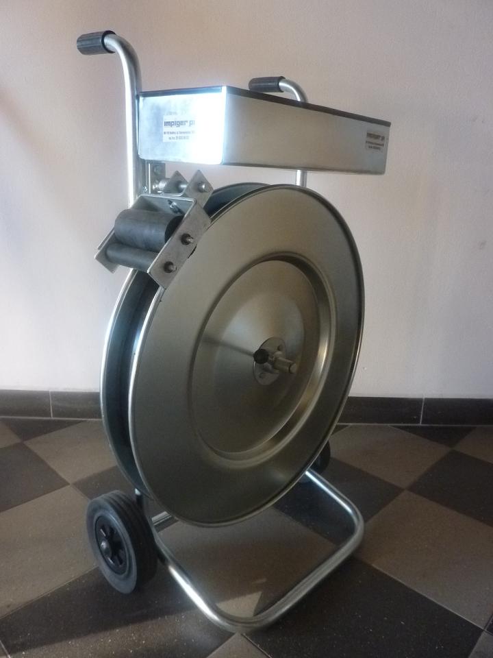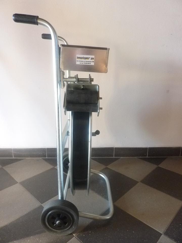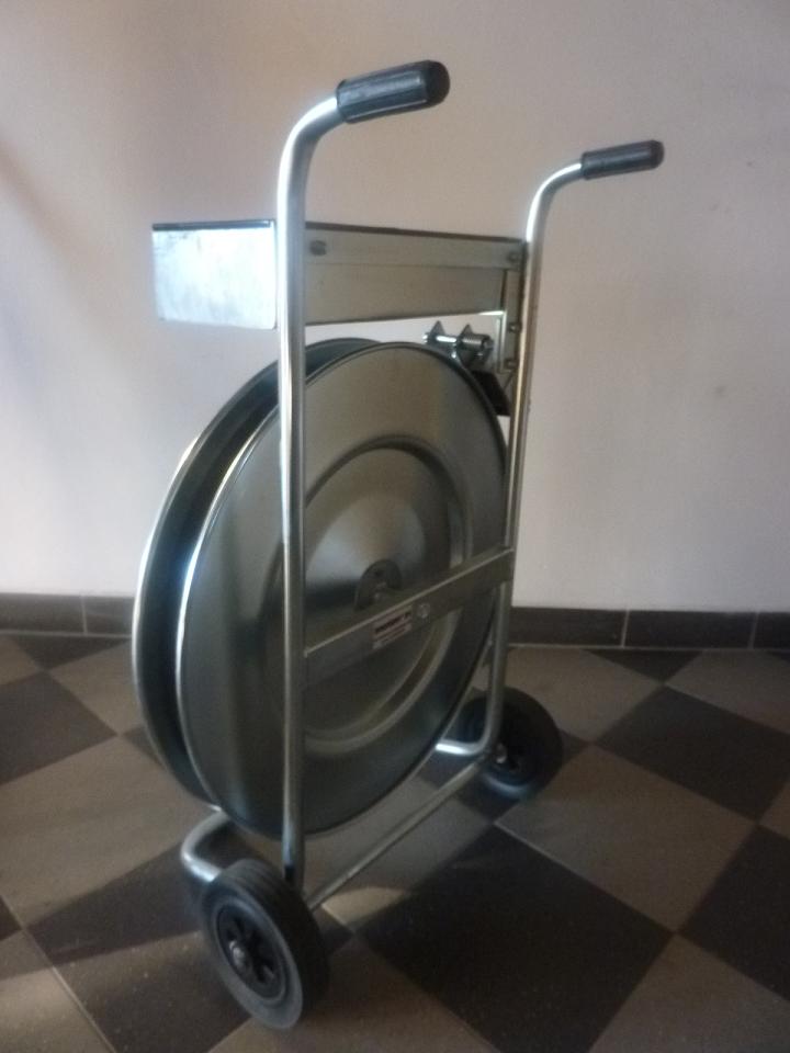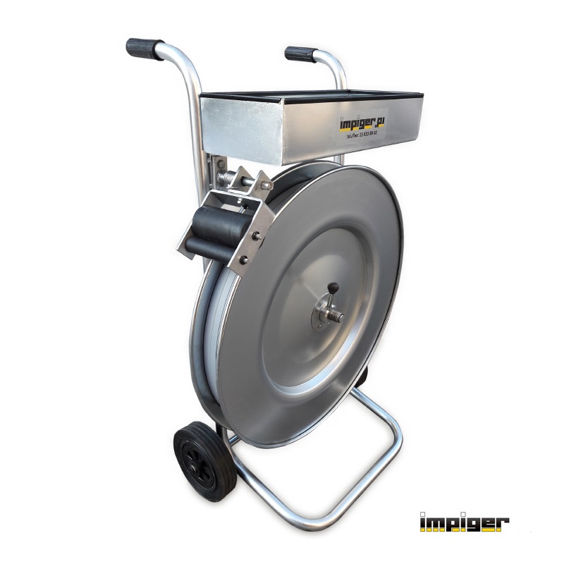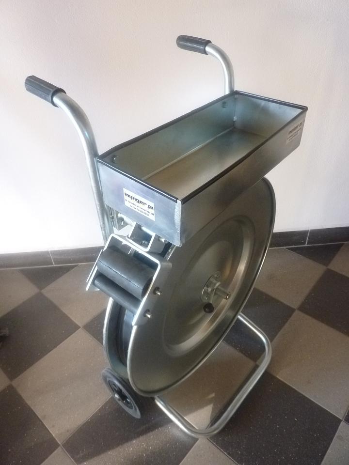 Odwijacz-Wózek służy do odwijania taśmy spinającej z rolki. Posiada hamulec oraz dwie metalowe tarcze zabezpieczające taśmę przed samoczynnym rozwijaniem się. W dużym metalowym pojemniku zmieszczą się bandownica, zapinki oraz inne akcesoria niezbędne przy spinaniu.