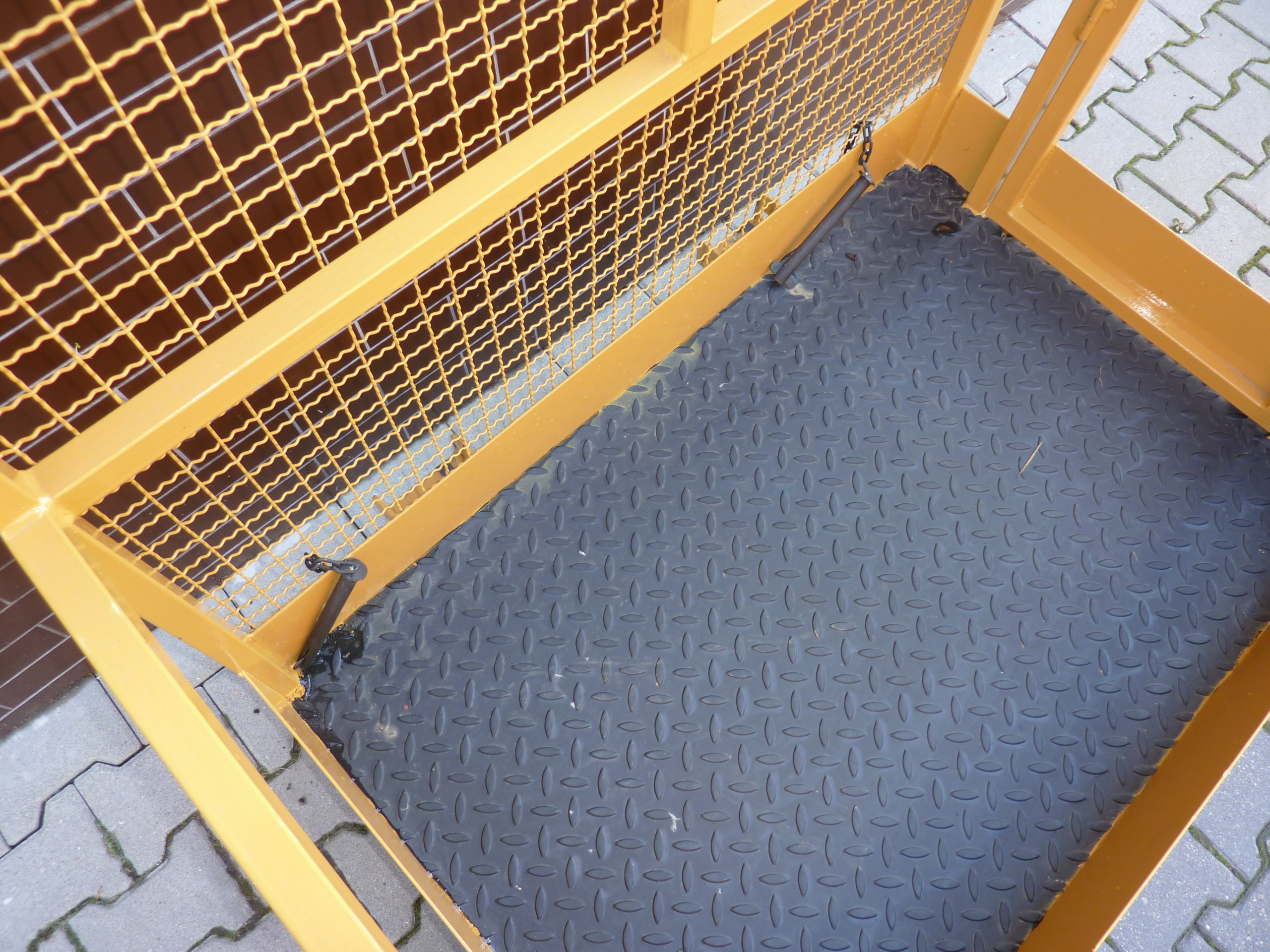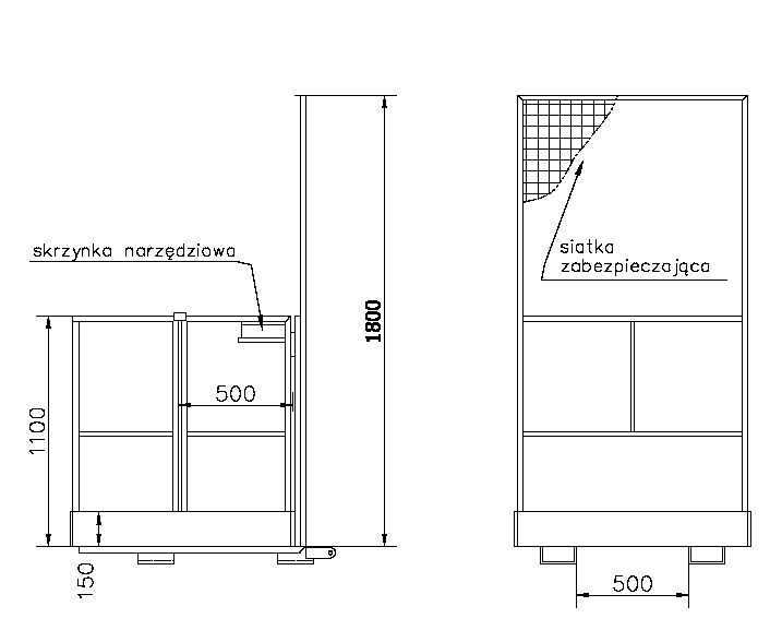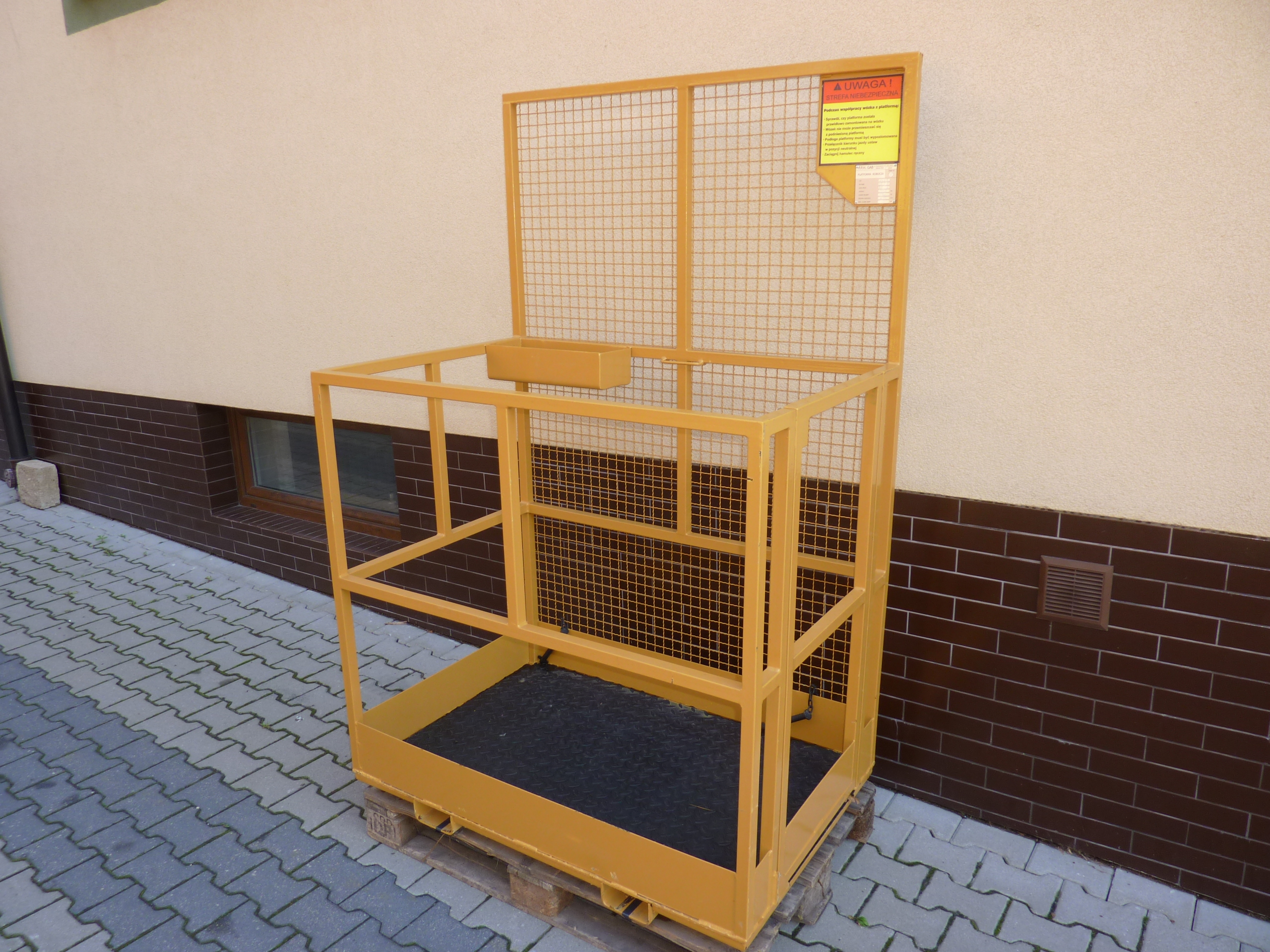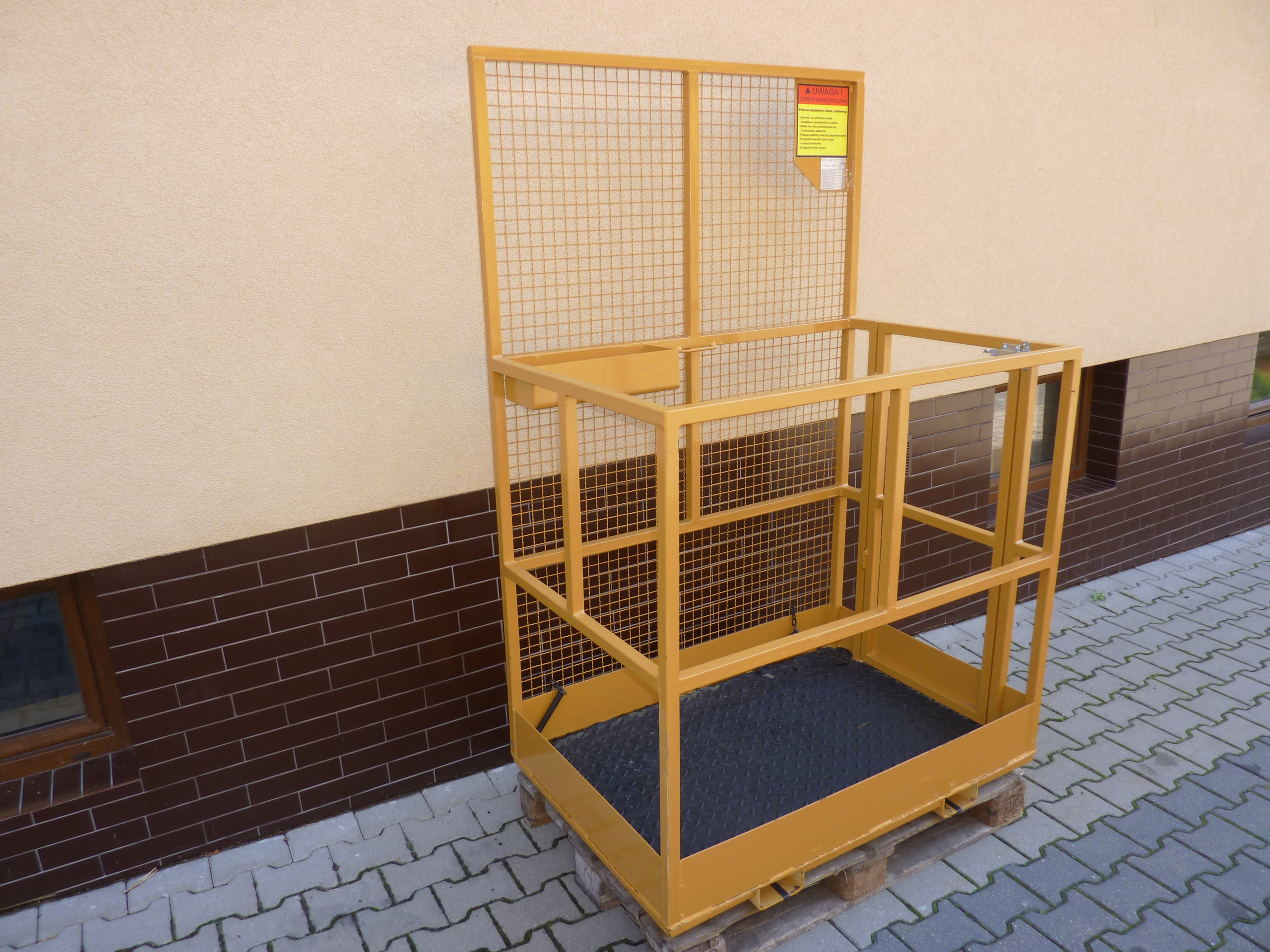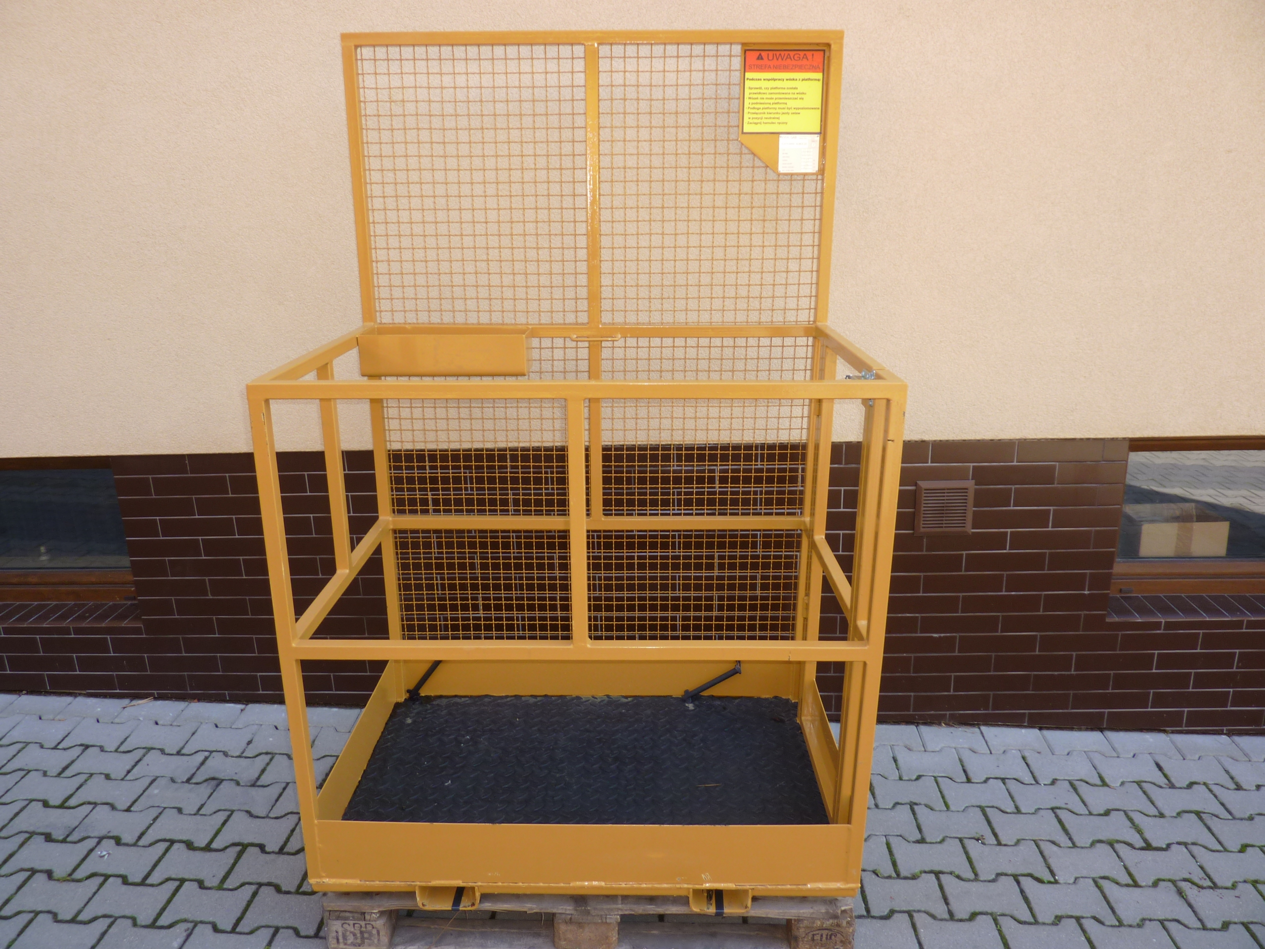 | Platforma robocza | * Osprzęt przeznaczony do zainstalowania na wózku podnośnikowym w celu stworzenia bezpiecznego stanowiska pracy * Mocowanie na widłach ze sworzniem zabezpieczającym * Platforma z wykończeniem przeciwpoślizgowym * Drzwiczki są zabezpieczone bezpiecznikiem przed samoistnym otwarciem |