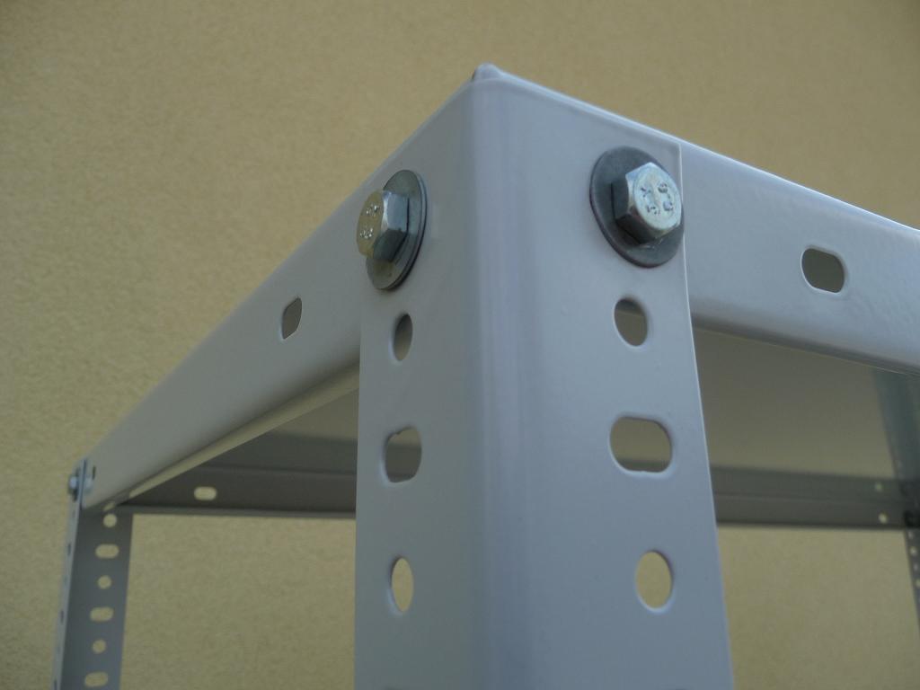 Regał składa się z czterech słupów nośnych z kątownika perforowanego 35x35 mm oraz z półek profilowanych z blachy montowanych na dowolnej wysokości. Każdy regał wyposażony jest w stopki z tworzywa sztucznego oraz komplet śrub. Regały malowane są lakierami proszkowymi. |
