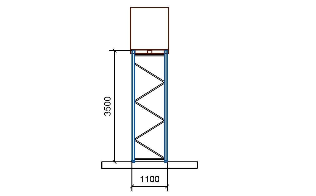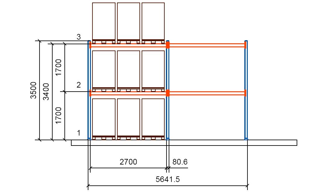 3 ramy kompletne 3,5m/1,1m P80, 6 stóp, kotwy 12/120mm ocynk, 3 podkładki do poziomowania 1 mm ocynk, 3 podkładki do poziomowania 3 mm ocynk, 8 belek(trawersów)2,7m nośność pary 3T, naklejki z nośnością 3T, tablice z udźwigiem, zawleczki do trawersów ocynk, deklaracja zgodności, instrukcja obsługi i użytkowania regału paletowego