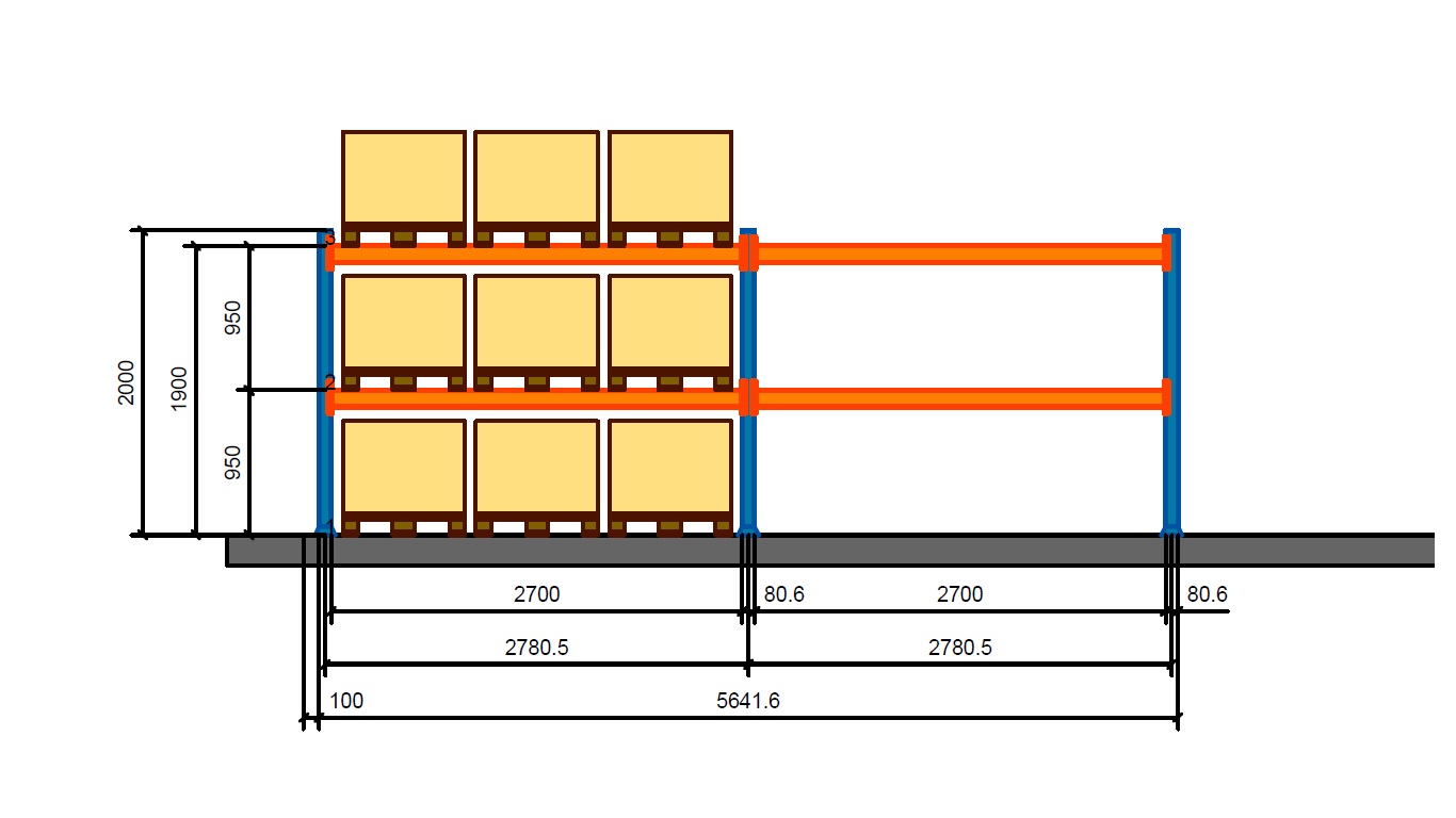 | Skład zestawu | 3 ramy kompletne 2m, 6 stóp , kotwy 12/120mm ocynk, 3 podkładki do poziomowania 1 mm ocynk, 3 podkładki do poziomowania 3 mm ocynk, 8 belek(trawersów)2,7m nośność 3T, naklejki z nośnością 3T, deklaracja zgodności, instrukcja obsługi i użytkowania regału paletowego |