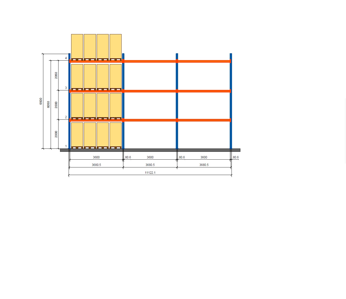 Regał paletowy nowy Regały paletowe 6,5 m (48 palet po 0,5t) z belkami 3,6m
