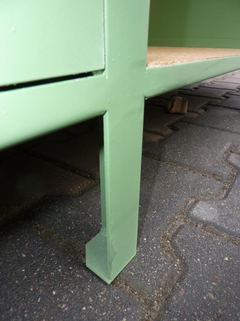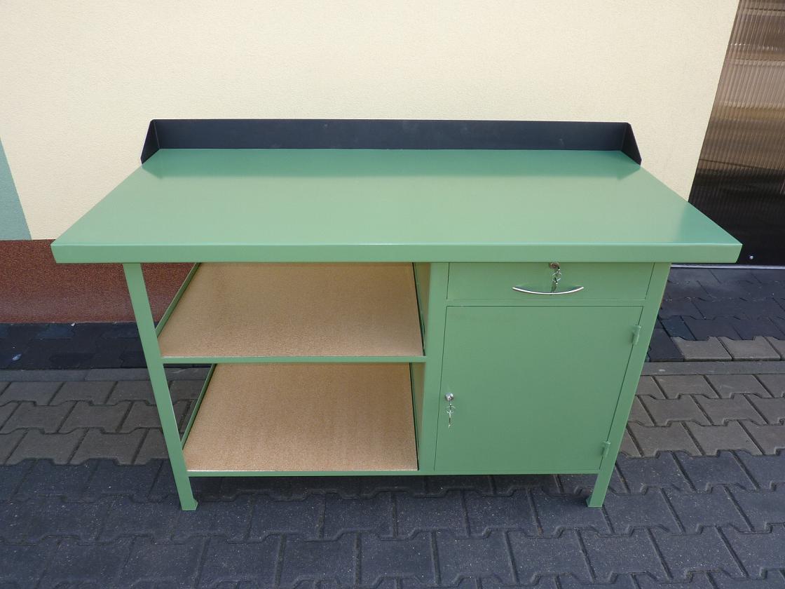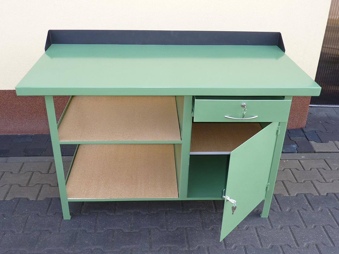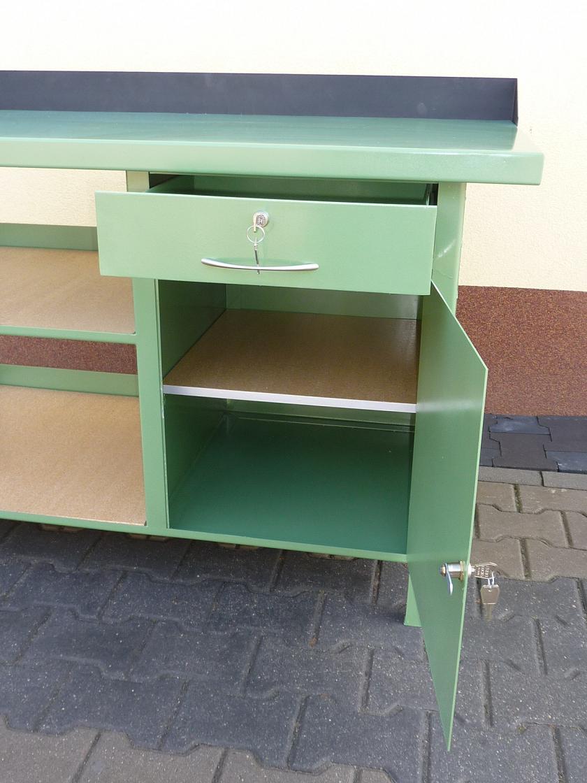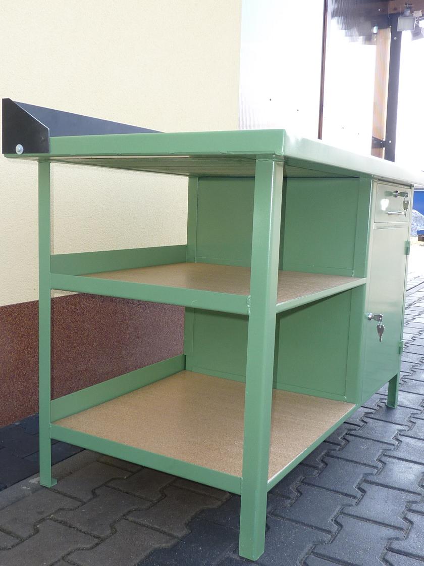 Stoły wykonywane są z kształtowników zimnogiętych. Blat jest drewniany, pokryty blachą. Szafka i szuflady zamykane na zamki bębenkowe. Szuflady na prowadnicach. Stoły malowane są na kolor jasnozielony lub inny (w/g życzenia klienta). Do tylnej części stołu przykręcana jest osłona oporowa. Za dodatkową opłatą: |