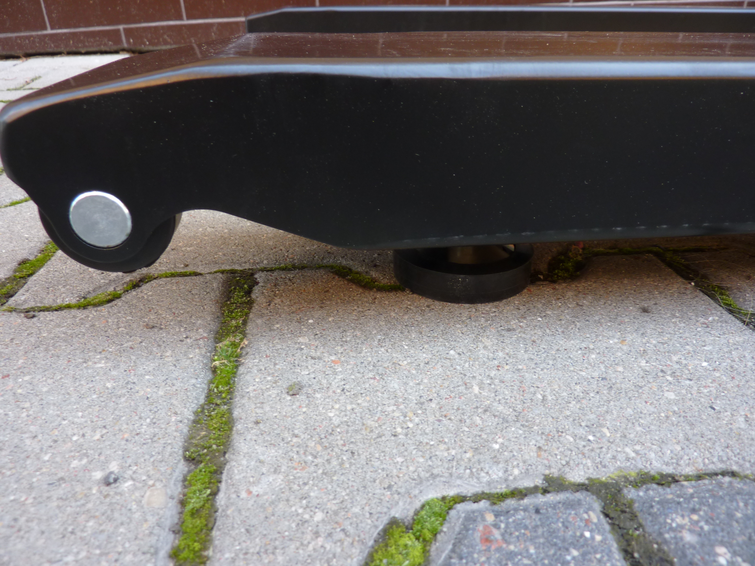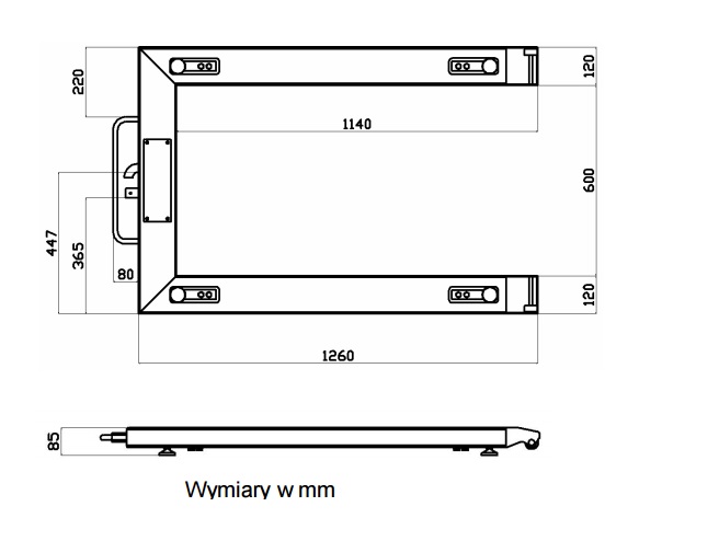 Profil zamknięty 120 x 60mm, czarna malowana proszkowo (również w wersji nierdzewnej). Wymiary zewnętrzne: 1260 x 840mm. z uchwytem ręcznym: 1340mm, wymiary wewnętrzne: 1140 x 600mm. Waga z rolkami i uchwytem do komfortowego transportu. Kabel do panelu sterującego o długości 5 metrów osłonięty po stronie wagi na wypadek uszkodzeń mechanicznych. Specjalnie płaski rodzaj konstrukcji nadaje się do ustawienia naziemnego. Ze względu na solidne tensometry DMS nie ma części zużywalnych