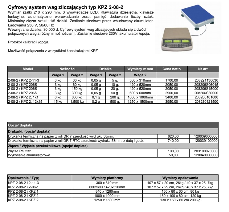 -Panel sterujący: KPZ 52-18 -Zasilanie: sieciowe 230 VAC -Zaświadczenie: dopuszczenie do legalizacji klasa III,deklaracja zgodności CE. Bez legalizacji. -nośność i podziałka oraz wymiar szalki w tabelce w zdjęciach