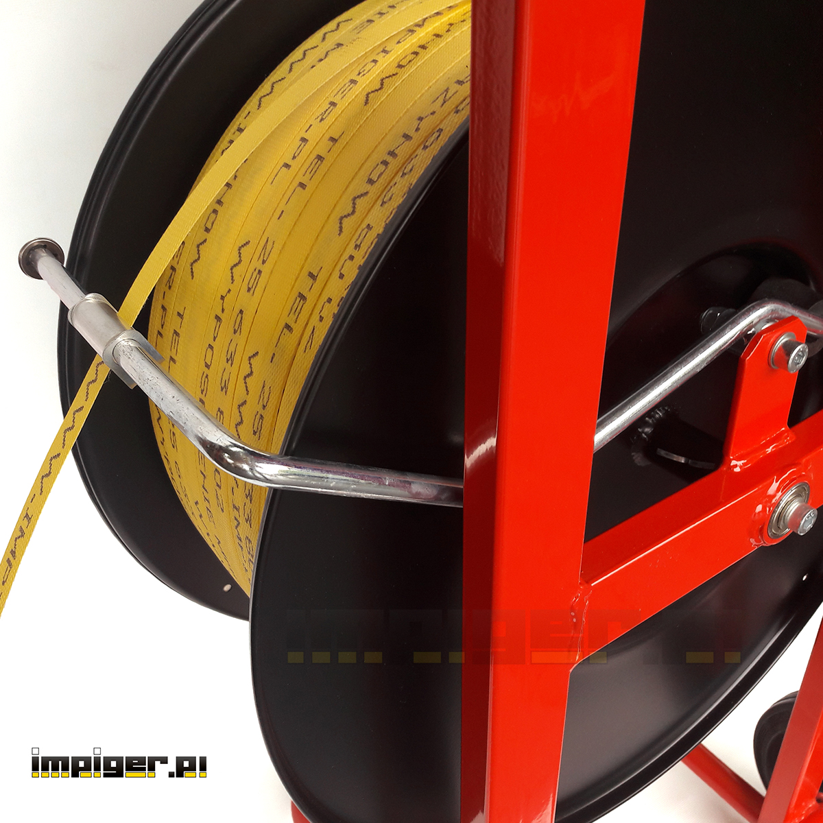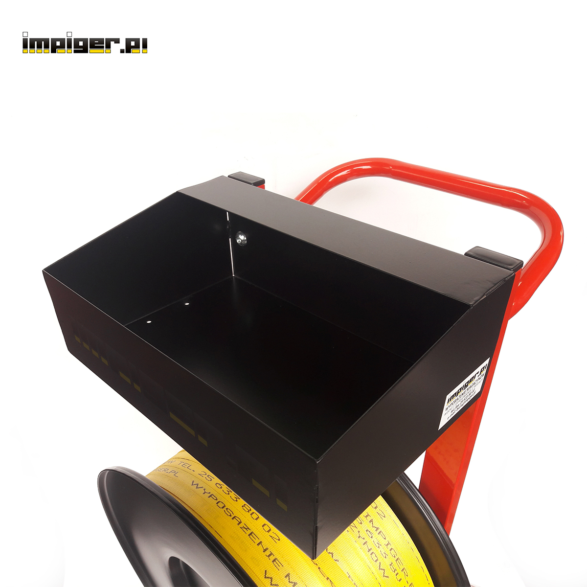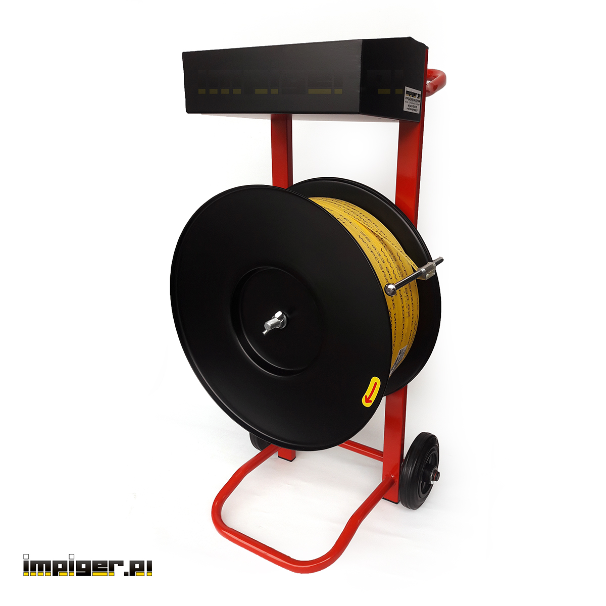 - Odwijacz-Wózek służy do odwijania taśmy spinającej z rolki. Posiada hamulec oraz dwie metalowe tarcze zabezpieczające taśmę przed samoczynnym rozwijaniem się. W dużym metalowym pojemniku zmieszczą się bandownica, zapinki oraz inne akcesoria niezbędne przy spinaniu.