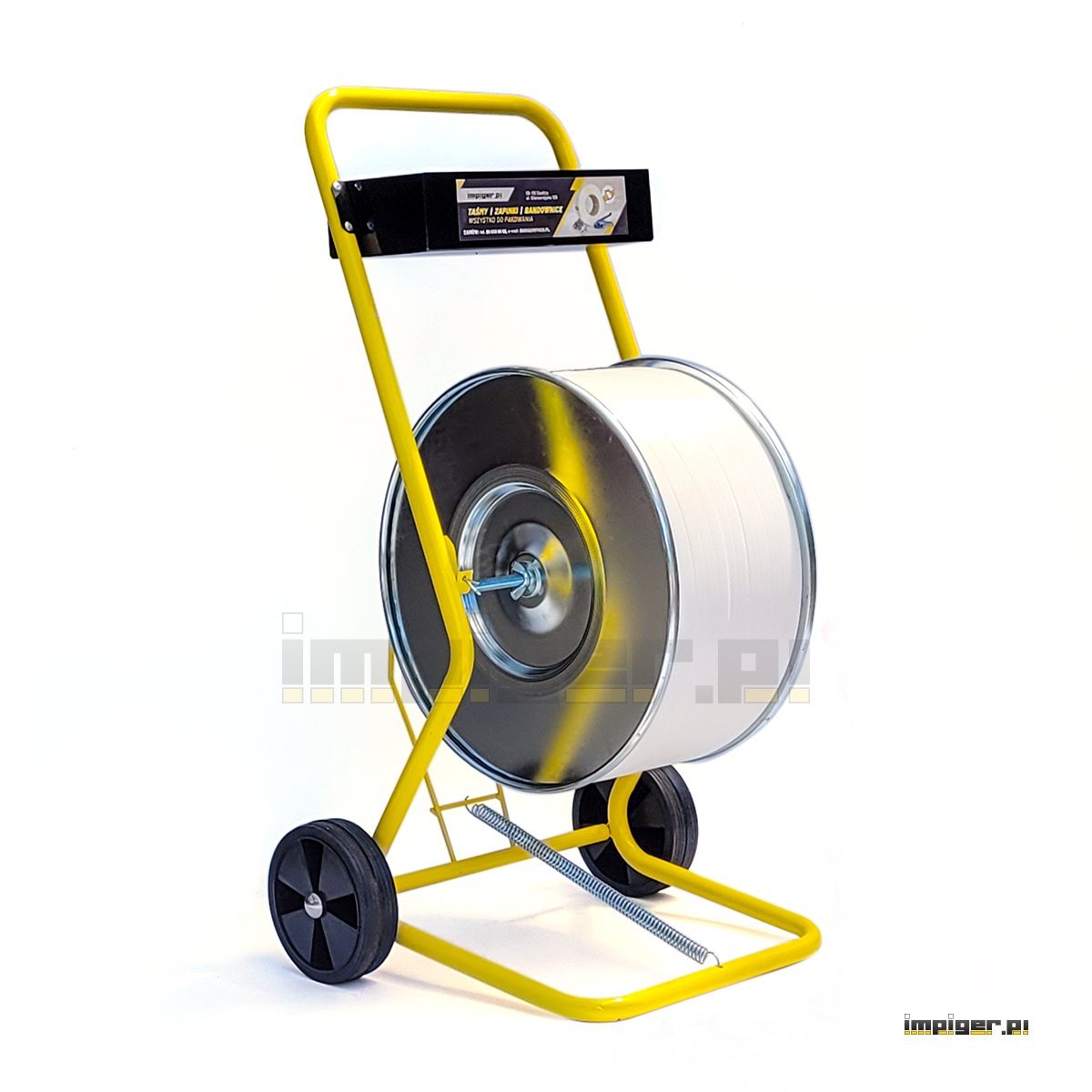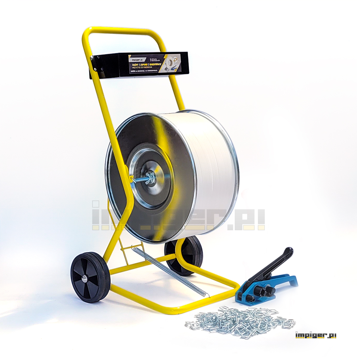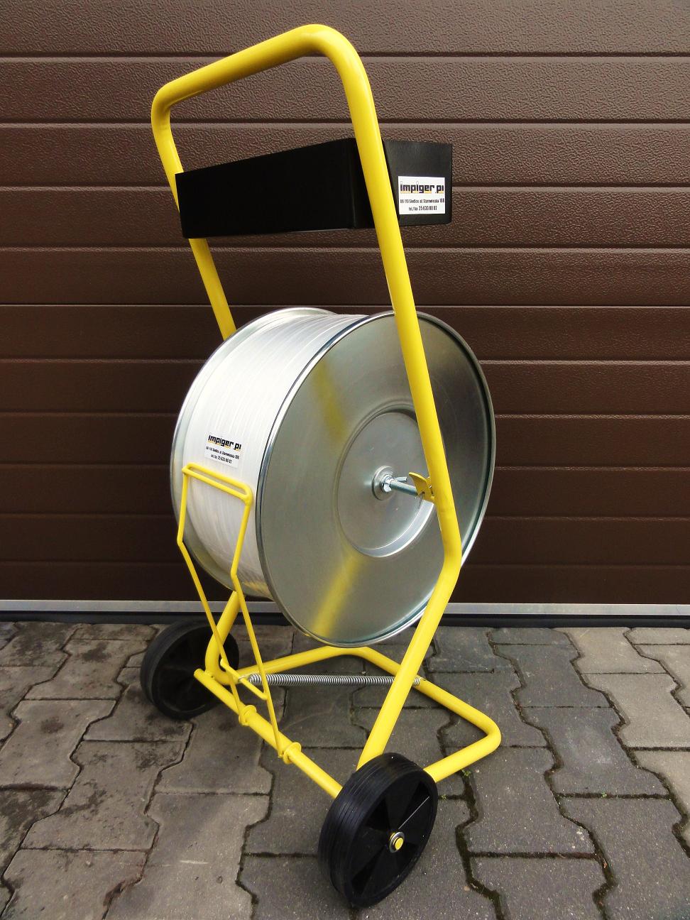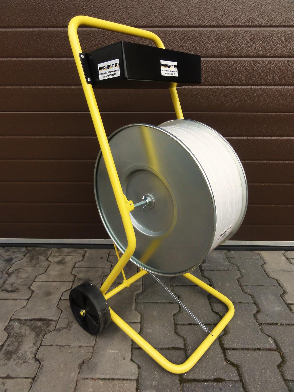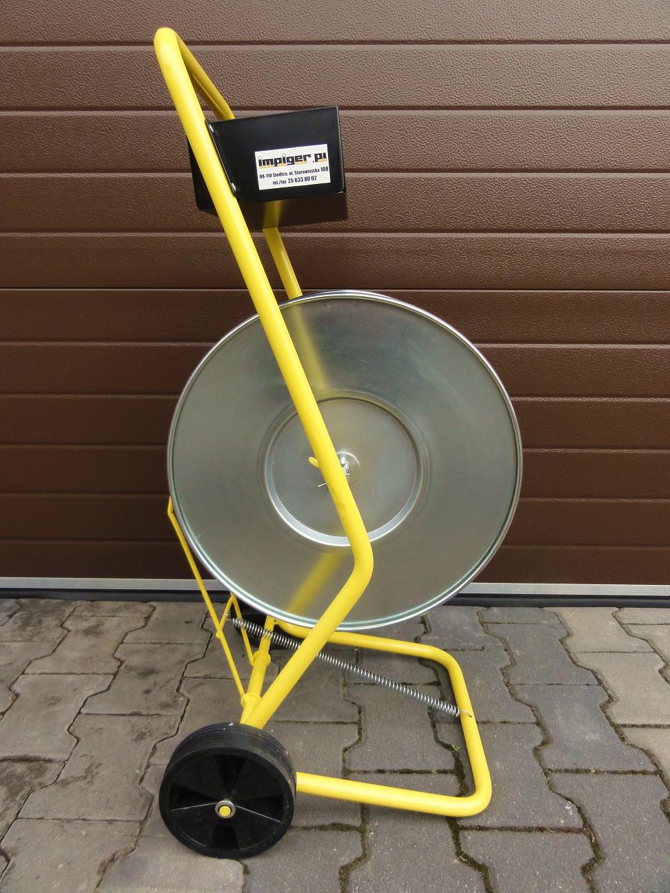 -  Odwijacz-Wózek służy do odwijania taśmy spinającej z rolki. Posiada hamulec oraz dwie metalowe tarcze zabezpieczające taśmę przed samoczynnym rozwijaniem się. W dużym metalowym pojemniku zmieszczą się bandownica, zapinki oraz inne akcesoria niezbędne przy spinaniu.