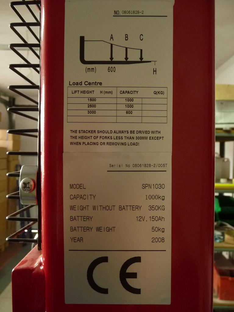 Wózek paletowy masztowy SPN 1030 (1T / 3m) elektryczny bez jazdy