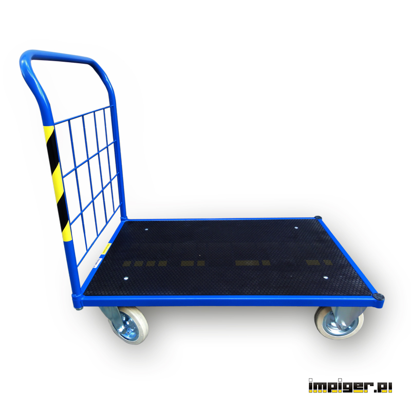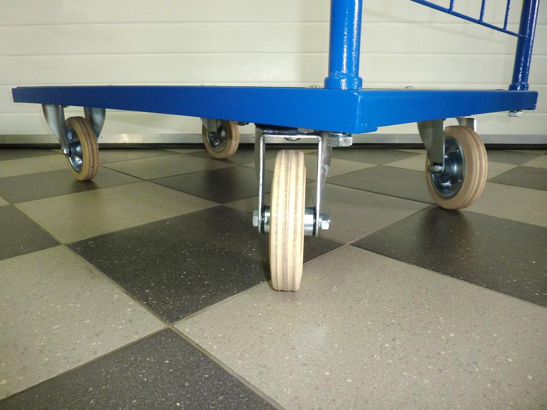 Trwała i mocna konstrukcja wózka została wykonana z wysokiej jakości stali co gwarantuje jego wytrzymałość i bezpieczeństwo użytkowania a wyposażenie w 4 pełne koła (szara niebrudząca guma) o średnicy 160 mm-2 stałe i 2 obrotowe- gwarantuje komfort pracy na równych powierzchniach, dużą zwrotność w małych pomieszczeniach oraz brak konieczności sprawdzania ciśnienia w oponach.