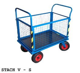Wózek Stach to uniwersalny wózek do transportowania różnego rodzaju towarów o masie nie przekraczającej 400 kg. Doskonale sprawdza się w magazynach, hurtowniach, sklepach, gospodarstwach rolnych i ogrodniczych. Przestrzeń ładunkowa wózka wypełniona została wodoodporną, antypoślizgową płytą o grubości 12mm, dodatkowo od spodu wspartą metalowymi wspornikami. Wózek posiada zabudowane siatką boki (burty) o wysokość 500 mm, co ułatwia transportowanie ładunków nieposiadających jednostkowych opakowań. Burty są łatwe w demontażu, krótkie są przykręcane, a długie montowane na zaczepy.