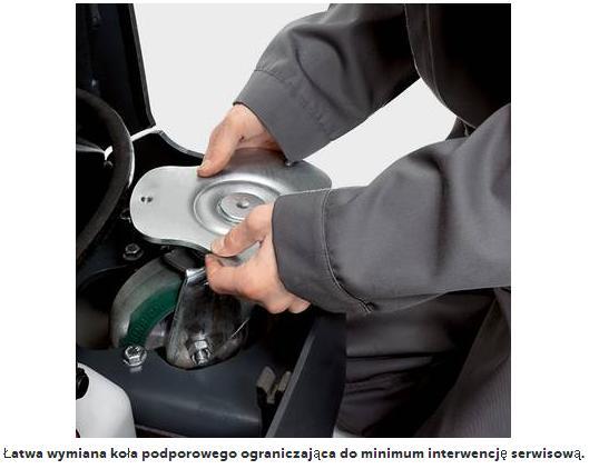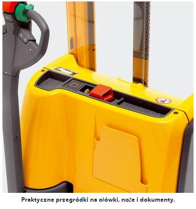 | Serwis | Nowocześnie skonstruowane wózki widłowe wymagają stosunkowo niewiele zabiegów konserwacyjnych. Układ napędowy i inne komponenty są bardzo dobrze dostępne, a maska korpusu i obudowa komory akumulatora dają się bardzo szybko otworzyć. Umożliwia to szybkie i sprawne przeprowadzenie prac konserwacyjnych oraz ograniczenie okresów przestoju do minimum. Okresy międzyprzeglądowe wynoszą obecnie 500 motogodzin. |