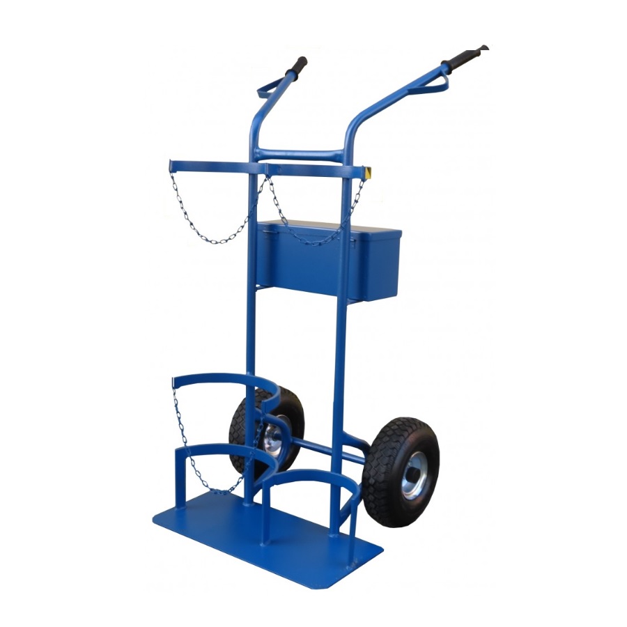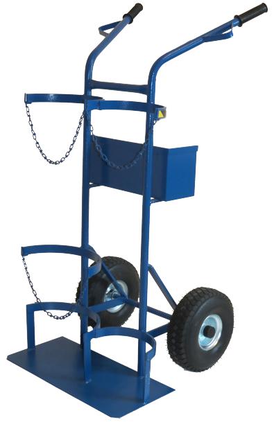 Polski wózek transportowy Benek przeznaczony jest do przewożenia butli z gazami technicznymi (tlen, acetylen oraz propan-butan) o maksymalnej średnicy 230 mm i wysokości nie przekraczającej 1700 mm oraz 315 mm dla butli propan-butan. Solidna stalowa konstrukcja wózka gwarantuje jego wytrzymałość i bezpieczeństwo użytkowania a zastosowanie potrójnego zestawu schodowego umożliwia bezpieczne transportowanie butli po schodach oraz prace na płaskich powierzchniach lub w małych pomieszczeniach. Co istotne całe zestawy jezdne są produkowane w naszej firmie z jasnej, niebrudzącej gumy. Platforma transportowa jest dostosowana do kształtu przewożonych butli, dodatkowe zabezpieczenie łańcuszkami gwarantuje bezpieczne ich przewożenie. Wózek wyposażony w skrzynkę narzędziową dla spawacza. Konstrukcja malowana jest proszkowo na kolor niebieski. Dwa polskie koła pneumatyczne dętkowe na felgach stalowych z łożyskami wałeczkowymi.