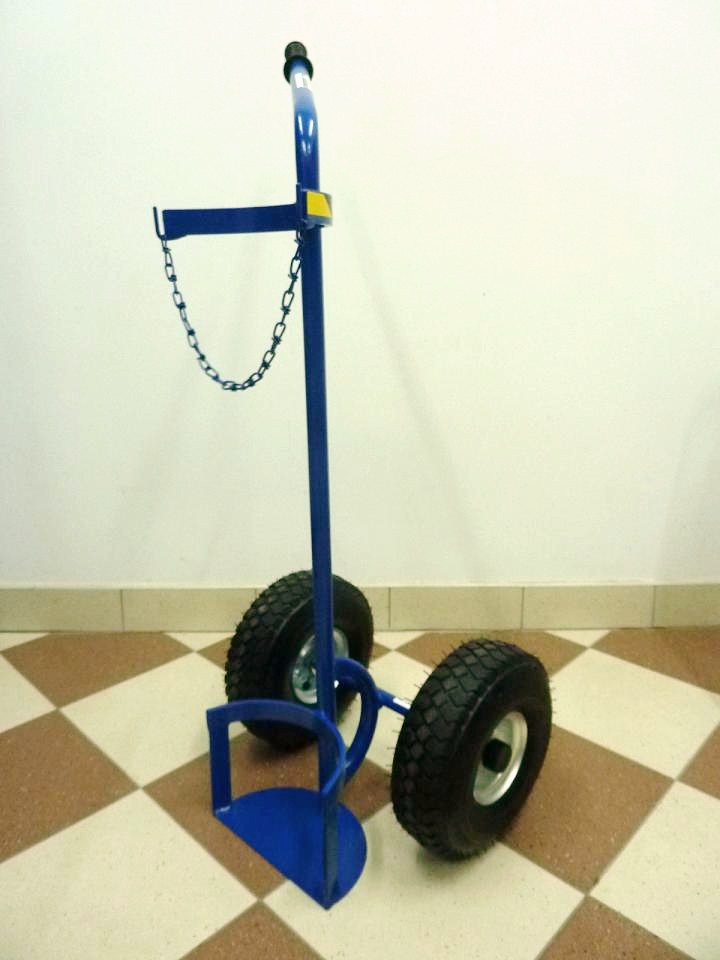 Polski wózek transportowy przeznaczony do przewozu butli z gazem technicznym (tlen, acetylen).