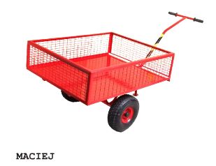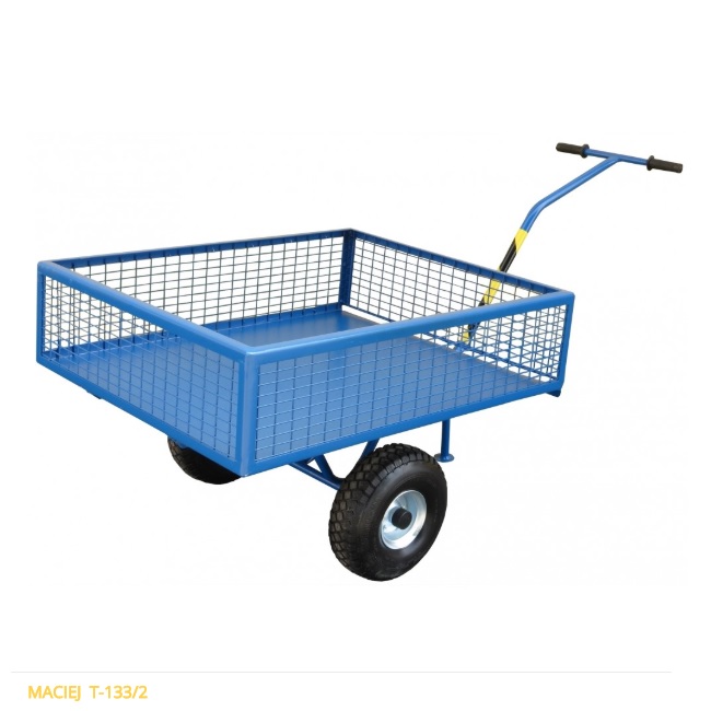 Wózek gospodarczy MACIEJ o solidnej konstrukcji stalowej, malowany proszkowo, zabudowa ażurowa z drutu, gumowane rączki, koła pneumatyczne łożyskowane. |