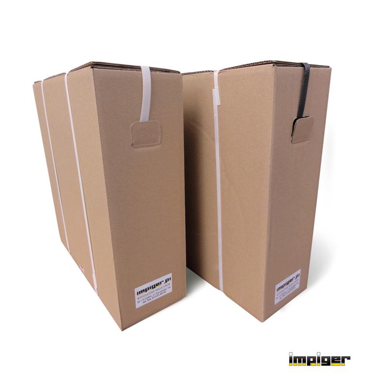 | W skład zestawu wchodzą: | * taśma PP 12mm / 1000m w kartonie * zapinki druciane 13mm / 500szt. * napinacz H21 (oryginał) |