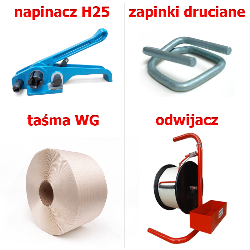 | W skład zestawu wchodzą: | *taśma poliestrowa 25mm/500m WG85 (wytrzymałość 950kg) *zapinka druciana 25mm/500szt. *napinacz H25 (oryginał) *odwijacz-stojak z hamulcem oraz metalowym pojemnikiem na zapinki i napinacz |